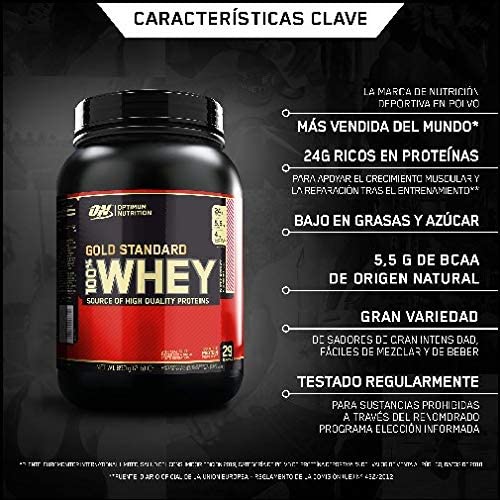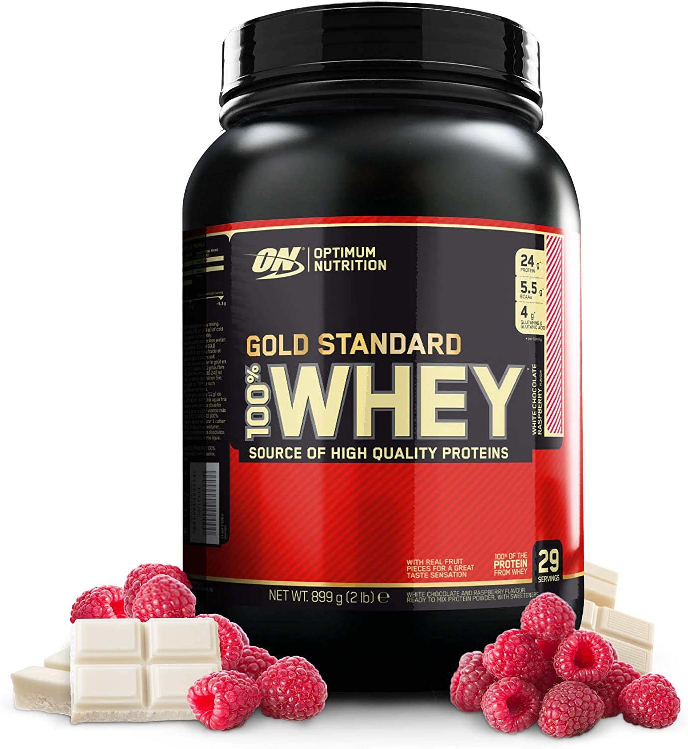 Optimum Nutrition ON Gold Standard 100% Whey Proteína en Polvo Suplementos Deportivos, Glutamina y Aminoacidos, BCAA, Chocolate Blanco y Frambuesa, 29 porciones, 900g,